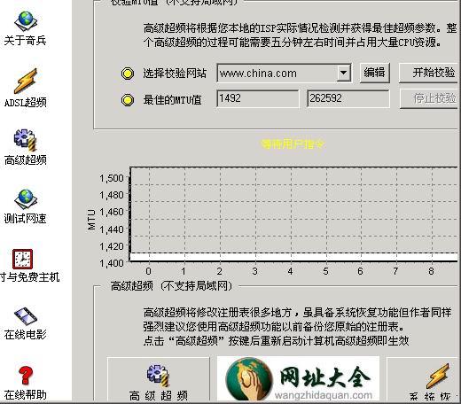 为了尽可能地将ADSL设备自身的“潜力”挖掘出来,你可以借助ADSL超频奇兵这样的优化工具,来对ADSL进行超频,以便提高你的上网冲浪速度。