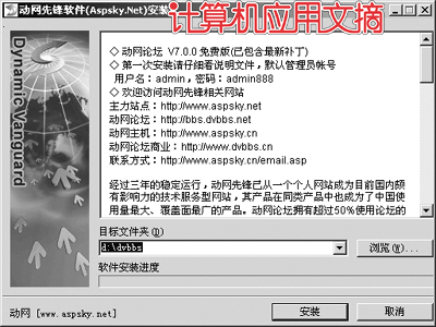 到动网的官方网站下载一个动网程序安装包,除此之外不需要再下载其他的补丁包。下载完毕后双击该安装程序将其安装到指定的目录中即可,这里笔者以安装到“D:dvbbs”为例(图1)。