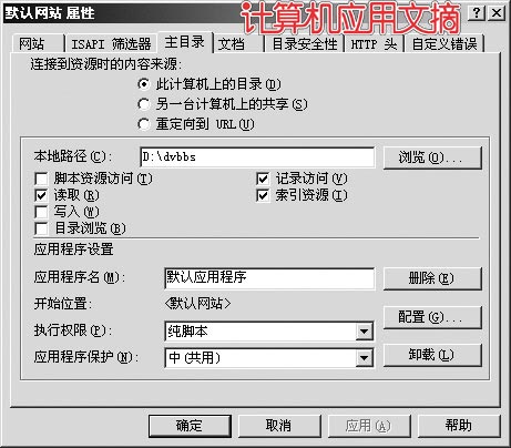 第一步:在“主目录”选项卡中定位论坛在硬盘中的位置。由于在前边笔者已经将论坛解压到“D:dvbbs”路径下,在此也在“本地路径”后边填入以上路径,其他的选项默认(图2)。