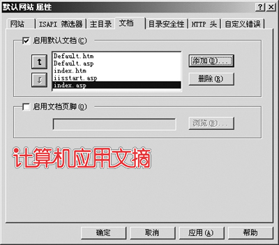 第二步:在“文档”选项卡中设置默认文件类型。由于动网论坛默认的主页文件是“.asp”,在“启用默认文档”选项中点击“添加”将“index.asp”加入默认文档中即可,这样论坛的索引页(index.asp)将成为默认的论坛首页(图3)。
