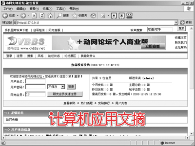 二、访问论坛 完成以上设置之后就能通过浏览器在本地访问自己的论坛,最简单的方法是打开IE浏览器在地址栏中输入“http://localhost/”或者“http://(你机器的IP)/”,即可进入论坛主页。此外输入“http://127.0.0.1/”也可以(图4)。