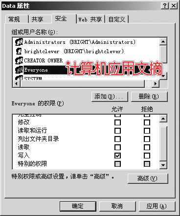 如果是Win2K/2003系统:在“data”上点右键查看,文件夹属性→安全,添加用户“Everyone”,然后点击“Everyone”用户勾上“写入”权限即可(图5)。