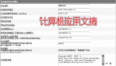 登入管理界面后,首先进入“基本设置”设置论坛的相关说明以及链接地址等,一个属于你的论坛就基本成型。 除此之外在该选项中还有上传、发贴和用户注册限制等相关设置,这里就是论坛的门面(图7)。
