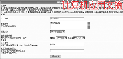 在安装完毕之后论坛中还是一片空荡,这里将通过“论坛管理”管理中的“版面(分类)添加 | 管理”选项来添加讨论区,只需依次在添加菜单中填入论坛名称、说明以及类别等信息之后点击“添加论坛”即可。建立或改变版面只需要点击“管理”二字,在该管理页面中可以对论坛的版面和说明做出任何改动(图8)。