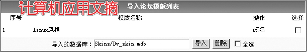 在http://down.dvbbs.net/有各种风格样式各异的论坛模板,足以满足你装饰论坛的大部分要求,这些模板的使用方法也很简单,将压缩包里的所有东西解压之后全部覆盖到论坛目录下的“skins”文件夹内,进入管理页面“外观设置”下的 “模板导出 | 导入”中选择“导入”,接着按照提示点击下一步,此时会发现所需要的风格已经在“导入论坛模版列表”中,勾选你所需要的模板选择“导入”(图9)。