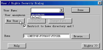 三、使用FTPD1、建立新的FTP帐号。①选菜单“Security→Users/rights”即进入用户属性窗口。如下图: