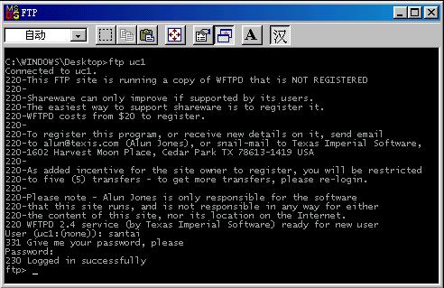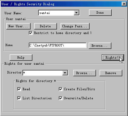 其中:a、“Home”为此用户登录后的虚拟根目录;b、“Rights”下为此用户的操作权限;c、“Director”中如果保持为“*”,则下面的权限适用此用户根目录下的整个目录树,否则只对“Director”中指定目录起作用;d、“Restrict to home...”项必须选中,否则此用户的活动范围将不受虚拟根目录的限制。下图为一个名为“santai”的用户登录后,选中此项时的操作屏幕(DOS环境):