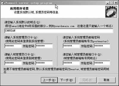 程序安装完毕后,自动进入设置向导。单击“下一步”按钮,即可进入“应用程序设置”窗口。在这里我们可以设置用户信箱的域名(即用户E-mail地址中@字符的后缀部分)和管理员口令。您可以向域名管理机构申请合法的域名。但是如果通信范围仅限于局域网内部,也可以通过内部的DNS服务器建立一个邮件服务器专用的域名。为叙述方便,我们使用了本机的机器名作为域名(在命令行窗口中键入“hostname”命令就能得到本机的机器名),本例中的机器名为CHHUIAN。然后设置系统管理员口令和邮箱密码以及域管理员口令和邮箱密码,以后在管理系统和域时会用到两个管理员口令(图1)。