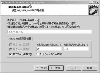 网络设置”窗口。在这里可以设定DNS地址、SMTP端口、POP3端口等信息。DNS地址栏中应该填入当地电信部门或您所在的ISP提供的DNS地址,当然如果您只是在局域网内部通信且使用机器名作为域名,则只需填入服务器IP地址即可。本例中的DNS地址为本机IP地址“10.115.223.10”。SMTP端口和POP3端口应该采用默认参数,不过在这里可能会遇到SMTP端口或POP3端口被占用的问题。我们应按照提示停止某些程序对该端口的占用,并且保证以后在运行FMS时这些应用程序始终被关闭。该窗口最下边有一个关于Esmtp的可选项,这是一种身份认证功能,与客户端的“SMTP服务器需要身份认证”配合使用,可以杜绝垃圾邮件的侵袭(图2)。