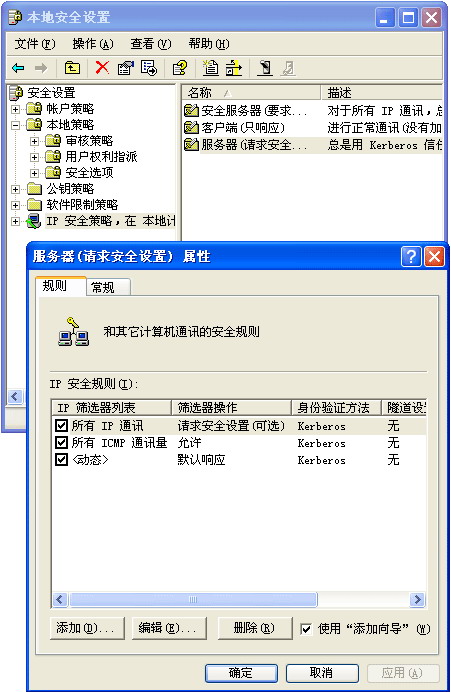 Windows 2000 开始,Microsoft 已经使用 IP 安全标准 (IPSec)(IPv4 协议的扩展)为管理 Internet 协议 (IP) 通信的身份验证和加密提供支持。下面的图 1 显示了“服务器(请求安全设置)属性”对话框的默认策略。我们特地为竞赛创建了一种策略。