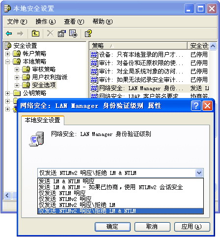 Windows XP 支持几种类型的身份验证协议。由于只有实现 NTLMv2 身份验证的计算机才能访问我们的数据库服务器,因此强烈建议将 LAN 管理器身份验证级别更改为“仅限于 NTLMv2”。注意,使用其他配置,