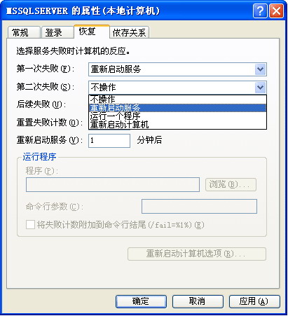 下一步,由于更多考虑的是可靠性而非安全性问题,我们设置了 Microsoft SQL Server 服务本身的属性,并将恢复操作更改为出现故障后重新启动服务。这样做是为了在出现故障时尽量减少停机时间。