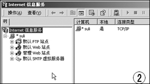 IIS控制界面步骤3点击其中的“打开Internet服务管理器”,弹出窗口(如图2)。我们看到其中“默认FTP站点”和“默认Web站点”都已经存在了。原来这两项都是