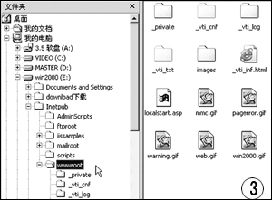 Windows操作系统所在盘符的“Inetpub”目录下面的“wwwroot”子目录中。我们只要把自己的网页扔到这里面就可以啦。
