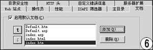 删除掉iisstart.asp,添加index.html,index.htm和index.asp(如图6)。最后再确定一下你的网站页面的首页就是以刚才的规则命名。重新在IE浏览器中敲入花生壳免费域名。哈哈,自己的网站总算是立足于浩瀚的互联网啦:)这种喜悦真的是无法用语言表达的。FTPWeb站点就这样搞定了,那么FTP也一并搞一搞吧。现在网上好多的朋友都在使用这个东东相互交流着丰富的多媒体影视资源。还记得刚才打开“Internet信息服务”窗口时,左则第一项的“默认FTP站点”吗?我们只需要在鼠标右键点击“启动”,就可开通它!(注意:如果你的设置窗口中并没有FTP这一项,那就是在安装