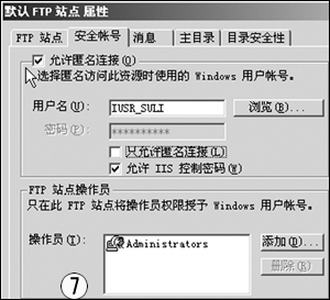 Windows系统所在盘符/Inetpub文件夹/ftproot文件夹。另外,如果都是好友之间的FTP交流,在FTP的站点属性设置窗口中(如图7),勾选“允许匿名连接”就可以了,这样大家使用起来比较方便。只要对方使用FTP软件,在IP地址一栏中输入你的IP地址就可以直接进入了。