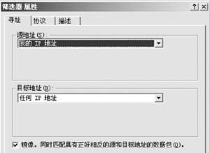 (2)在“IP筛选器列表”对话框窗口中单击“编辑”菜单选项,启动“筛选器属性”对话框窗口(如图4所示),利用对话框中的“寻址”、“协议”、“描述”选项卡更改指定筛选器列表的属性设置。例如:利用“寻址”可以更改IP通信的源地址和目标地址设置。