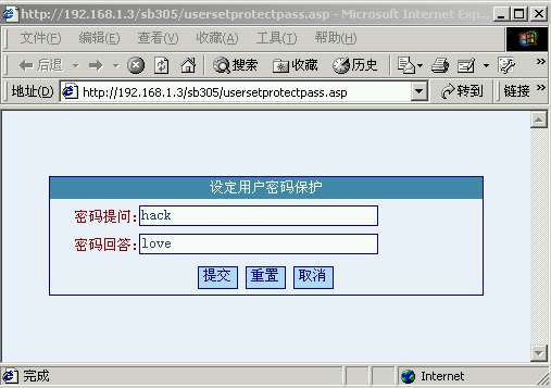 http://192.168.1.3/sb305/usersetprotectpass.asp?remand=hack&answer=love&B1=%CC%E1%BD%BB