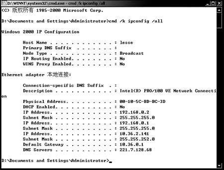 Windows 2000/XP下按“开始→运行”,输入“cmd /k ipconfig /all”,其中“Physical Address”就是MAC地址(如图1)。