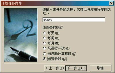 在一台学生机上建立一个任务计划如图2所示。“计划任务”名称为Start。让该任务计划运行教师机的批处理程序Start.bat,并且在计算机登录时运行,如图3所示。然后打开该计算机的C:\