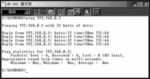 网络是否已经正确连通。此时,大家可以在MS-DOS方式下用Ping命令来检测。具体命令是ping 192.168.0.1(192.168.0.1为另一台机器的指定IP地址)。如果一切设置正确的话,那么应该出现如下的画面(图2)。