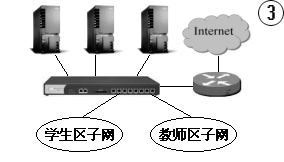 网络分三个网段(202.100.204.152,子网掩码为为255.255.255.248,为服务器区子网;192.168.2.0为教师子网;192.168.3.0为学生机房子网)。另外,内网接通了DDN专线,路由器对内的以太口地址为202.100.204.158,IP转发主机的IP地址为192.168.2.254。教师子网和学生机房子网的计算机能够访问服务器区子网上的内部服务器,还能直接访问Internet。