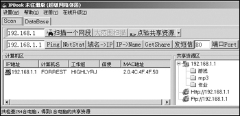 运行IPBook以后,它会获取本机的所在的IP网段和IP地址,并把它们分别填入左边的IP网段和IP地址框里,如图1所示。此时你只需要点击[点验共享资源]按钮,