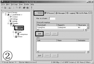在管理器左边列表中选择“Domains(域)”下面的“Settings(设置)”,在右边的框架中切换到“General(常用)”页面。单击图2中的“ADD(添加)”按钮,然后在“Physical Path(物理路径)”栏中输入\\imc\two,按“Next”,在“Map Physical Path to(映射路径)”栏中输入\\imc\one,按“Next”,在“Mapped Path Name(映射路径名称)”栏中输入“two”,按“Finish”完成。步骤二:在左边列表中点选“Users(用户)”下的“Anonymous(匿名)”用户,然后在右边框架中切换到“Dir Access(目录存取)”页面,按“Add(添加)”按钮,在栏中输入\\imc\two,然后按“Finish”完成。现在按一下Serv-U工具栏中的“刷新”按钮,在IE地址栏中输入“ftp://192.168.0.2”访问的是\\imc\one共享文件夹下的内容;输入“ftp://192.168.0.2/two”访问的是\\imc\two共享文件夹下的内容,按照这个办法一次性给所有共享文件夹都增加虚拟目录,以后要访问其他的共享文件夹就不用修改“主目录”啦!