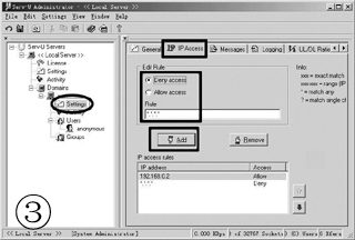 以上架设的FTP服务器,局域网中的其他用户也能通过它来访问共享文件夹,换言之局域网中的其他用户也能用到续传文件的功能。但如果你不想别人利用你的FTP服务器来访问共享资源的话,你可以在Serv-U的左边列表中点选“Anonymous”用户,在右边框架中切换到“IP Access(IP访问)”页,点选“Deny access(拒绝访问)”,然后在“Rule(规则)”栏中输入“*.*.*.*”,按“Add(添加)”按钮,接下来再点选“Allow Access(允许访问)”,在“Rule(规则)”栏中输入本机在局域网中的IP地址,按“Add(添加)”按钮,“刷新”一下设置(见图3)。现在局域网中就只有你可以用FTP服务器来访问共享文件夹,而其他用户就不能通过你的FTP服务器来访问共享资源了。用“TotalCopy”实现“TotalCopy”是一款能够在局域网中实现文件续传的免费软件,下载地址为:TotalCopy 1.1。根据这个地址把程序下载后,将得到的ZIP压缩包解开。双击其中的tcll.exe文件,然后在弹出的对话框中单击左下角的“Install”按钮进行安装。