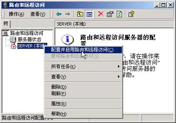 (3)如果以前已经配置过这台服务器,现在需要重新开始,则在 "SERVER"(服务器名)上单击右键,选"禁用路由和远程访问",即可停止此服务,以便重新配置!