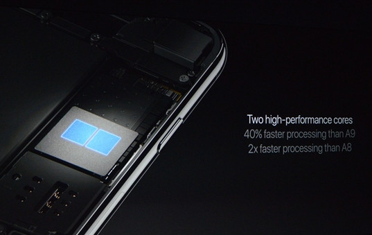 最后一个全新的设计,强大的A10处理器。两个高性能大核心,比A9快40%,比A8快一倍。64位四核!!!A10 Fuison。33亿个晶体管。