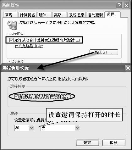 依次点击“开始→控制面板→系统”,在“系统属性”窗口中切换至“远程”选项卡,在该选项卡中勾选“允许从这台计算机发送远程协助邀请”选项,然后点击“高级”按钮,在弹出的“远程协助设置”窗口内勾选“允许此计算机被远程控制”(图1)。这样,果冻便可以在局域网内的任意一台Windows XP的电脑中远程操控草莓的电脑了。