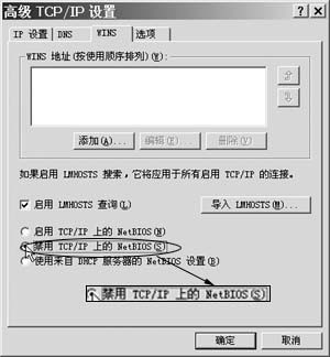 卸载不必要的协议(如图1)。NETBIOS是很多安全缺陷的源泉,对于不需要提供文件和打印共享的主机,还可以将绑定在TCP/IP协议的NETBIOS给关闭,避免针对NETBIOS的攻击。选择[TCP/IP协议]→[属性]→[高级],进入“高级TCP/IP设置”对话框,选择“WINS”标签,勾选“禁用TCP/IP上的NETBIOS”一项(如图2),关闭NETBIOS。