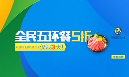 从8月5日起,饿了么APP的主题就换成了里约奥运会黄蓝绿色。原来,在里约奥运会期间,饿了么将全面上线“全民饿运会”大型促销活动,活动范围覆盖全国约30个城市。活动期间,平台不仅将推出品牌餐厅5折、奥运套餐7折等美食折扣活动,更有贴心优惠满足不同用户需求。