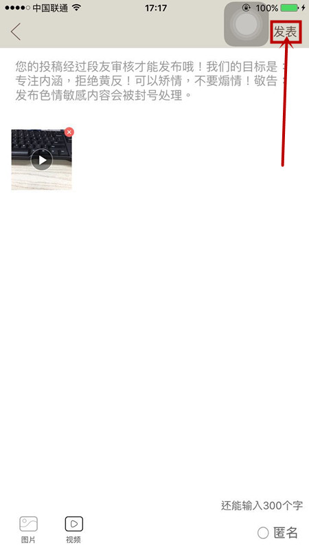 直接好时候后,直接点击右上角的发表,你可以在个人信息中看到录制的视频显示在审核中,只要审核通过,视频就会自动发布啦!
