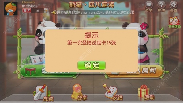 首先进入游戏之后映入眼帘就是一项免费福利,玩家在第一次登陆游戏之后便可免费领取房卡15卡,让你在游戏中可以自己开设房间邀请朋友一起来打麻将!而画面高清简洁,让玩家一目了然!