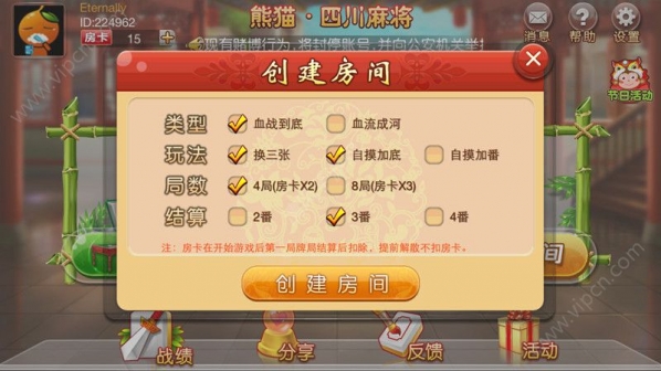 接下来我们就来看一看创建房间的需求,房卡当然是必不可少的,玩家可以选择自己喜欢的麻将的类型以及玩法,同时也能对局数做出设定,最后还能对倍数进行设定,可谓选择丰富多样。