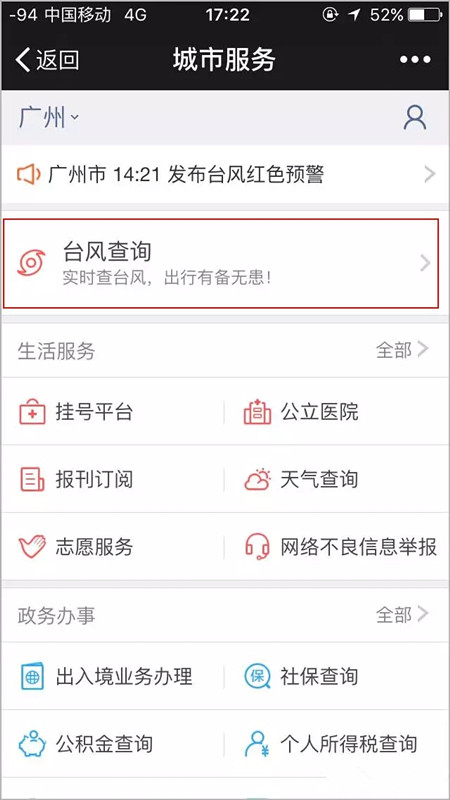打开微信,点击“我-钱包-城市服务-台风查询”