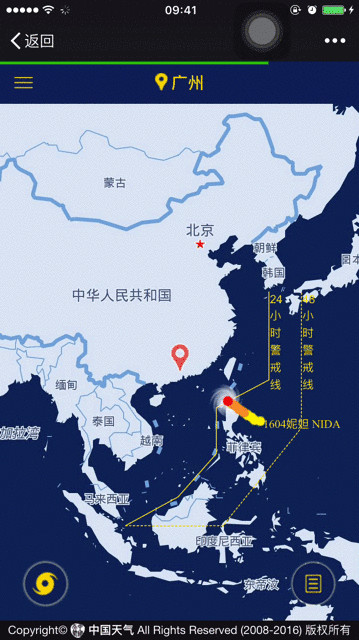 现在,会受到超强台风影响的广东、广西两省用户,点进台风查询,都可以查看到中国气象局中国天气网发布的台风妮妲NIDA实时路线图。