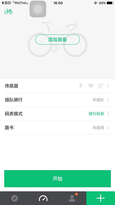 2、选择添加装备,传感器、组队骑行、码表模式、路熟后点击开始