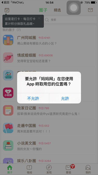 3、第一次进入会显示在使用妈妈圈时取用您的位置,可以选择允许,这样方便进入圈子界面的同城板块交流。