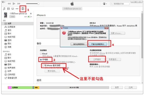 2,在电脑上安装并打开iTunes软件,点击iTunes窗口左上角的iPhone小图标,然后选择“本电脑”并点击“立即备份”按钮。如果弹出窗口询问是否备份应用程序的话,请点击“不备份应用程序”,如果还弹出窗口询问是否对备份数据加密的话,请点击“不加密”。