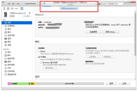 3,备份过程是将苹果手机中的全部数据导出到电脑上,包括手机上所有app产生的数据,当然也包括我们所需要的苹果手机微信聊天记录数据。因为手机中的数据往往比较多,因此备份通常需要比较久的时间。在备份完成前,请不要操作手机,更不要把手机从电脑上移除。当下图窗口顶部的进度条消失后,才说明备份完成。