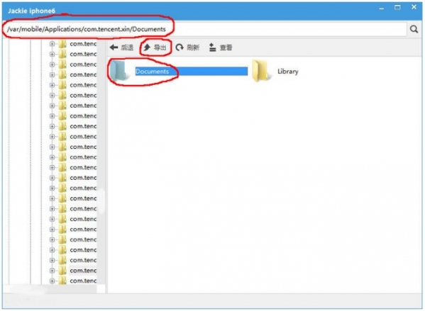 6,进入var/mobile/Applications/com.tencent.xin/,然后选中Documents文件夹再点击“导出”按钮将其导出。