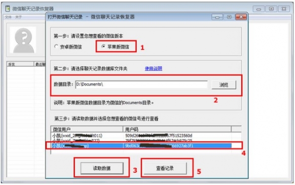 7,下载并打开“微信聊天记录恢复器”软件,该软件又名为“楼月微信聊天记录导出恢复助手”,该软件为免安装的绿色软件,下载后将其打开,按下图进行设置,其中微信版本要设置为“苹果版微信”,数据目录要设置为前面导出的Documents文件夹,设置好后点击3处的读取数据按钮,然后软件会对Documents里面的所有文件进行分析,并提取出里面曾经登陆过的微信号显示在软件界面上,我们选择一个想恢复微信聊天记录的微信号后,点击5处的“查看记录”按钮即可。