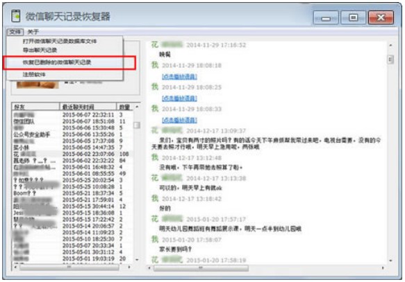 8,此时,我们就可以在软件界面上查看苹果手机微信聊天记录了。但是本文要说明的是苹果手机微信聊天记录删除了怎么恢复的问题,很简单,我们只需要点击下图中的“恢复已删除的微信聊天记录”菜单即可。