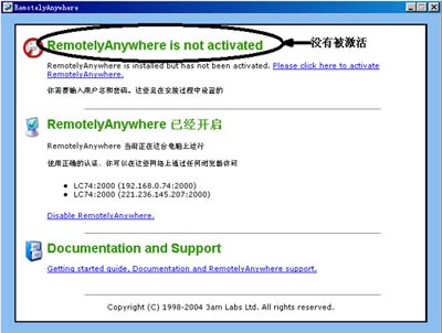第一步:双击打开任务栏托盘里的RemotelyAnywhere图标,会弹出RemotelyAnywhere界面(图1),单击“RemotelyAnywhere is not activated”下的“Please click here to activate RemotelyAnywhere”蓝色字样。