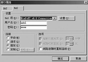 (4)在图4所示界面中点击“RAS”标签,设置好拨号连接的用户名和密码,在“连接”中选择“固定”(自动连接、无限次重拨)。