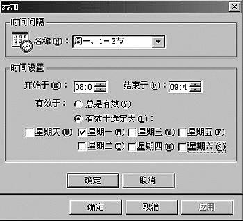 2.设置时间表 以双休日、课外活动和星期一、二为例。 (1)依次点击“设置→高级→时间间隔”。 (2)在图5所示界面的名称栏中填入“周一、1-2节”,设置时间间隔为8:00~9:40,有效于星期一。