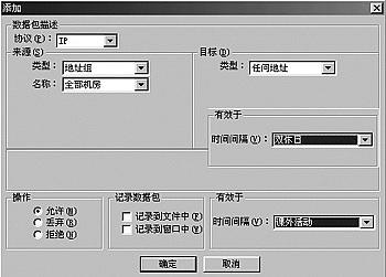 (5)添加北机房规则,依次设置以下时段为允许:周一的1~2节和5~6节、周二的1~2节。(6)添加南机房规则,依次设置以下时段为允许:周一的3~4节、周二1~2节和3~4节。(7)添加最后一条规则,内容为协议:IP来源:任何地址目标:任何地址操作:拒绝有效于:总是